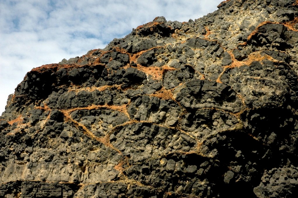 Afloramento de basalto recente (Lava Stampar do ano 1200 AD) na Cordilheira Meso-oceânica Atlântica aflorante em Valahnúkur, Sul da Islândia. Cada pillow tem cerca de 60 cm de diâmetro e apresenta-se envolta por palagonita amarelo-amarronzada que se originou pela reação da água do mar com a lava durante o derrame. Foto tirada com teleobjetiva devido a inacessibilidade do afloramento.