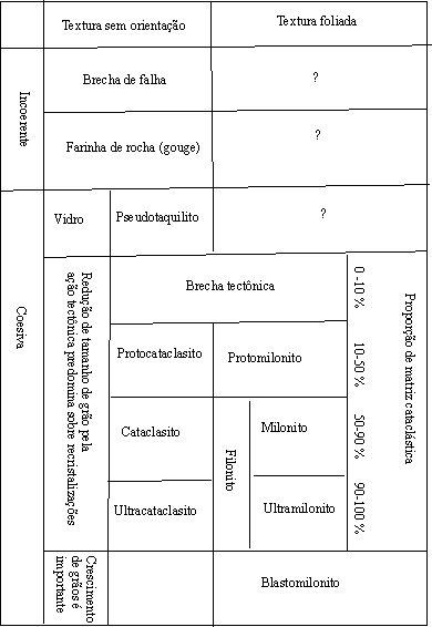 Classificação de Rochas Cataclásticas (metamorfismo dinâmico) baseada em Sibson,R.H. 1977. Fault rocks and faults mechanisms. J. Geol.Soc.London, 133:191-213
