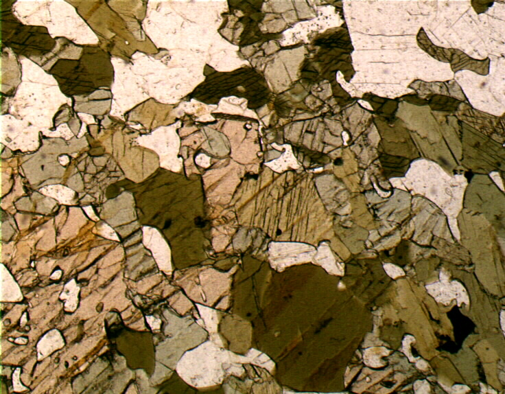 Amostra acbo 1 a 29 km acbo 1 a 29 km Granada-clinopiroxênio granulito com hornblenda de Botelhos, MG. Rocha de alta pressão indicada pela reação ortopiroxênio + plagioclásio = clinopiroxênio + granada. Algumas partes da rocha, vistas nas outras lâminas, mostram ainda restos de ortopiroxênio. Posterior hidratação forma a hornblenda.