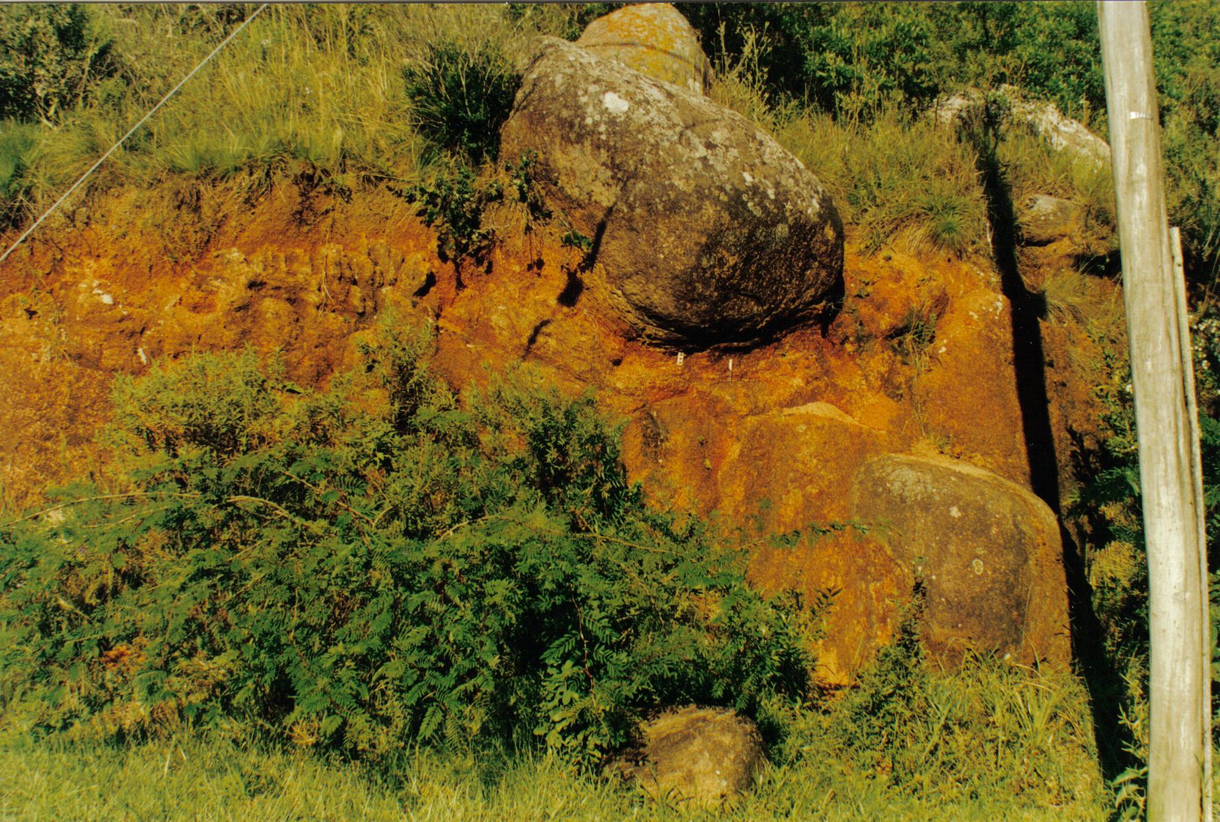 Matacões (boulders) arredondados de granito desenvolvidos por processo de intemperismo com exfoliação esferoidal podem formar campos de boulders quando a erosão retira o solo e deixa os matacões in situ espalhados sobre o terreno (ver foto). Na foto, pode-se perceber restos de estruturas (fraturas) e blocos pouco intemperizados no solo vermelho alaranjado saprolítico, atestando a origem autóctone do solo por alteração intempérica do granito. (Ver foto de detalhe)