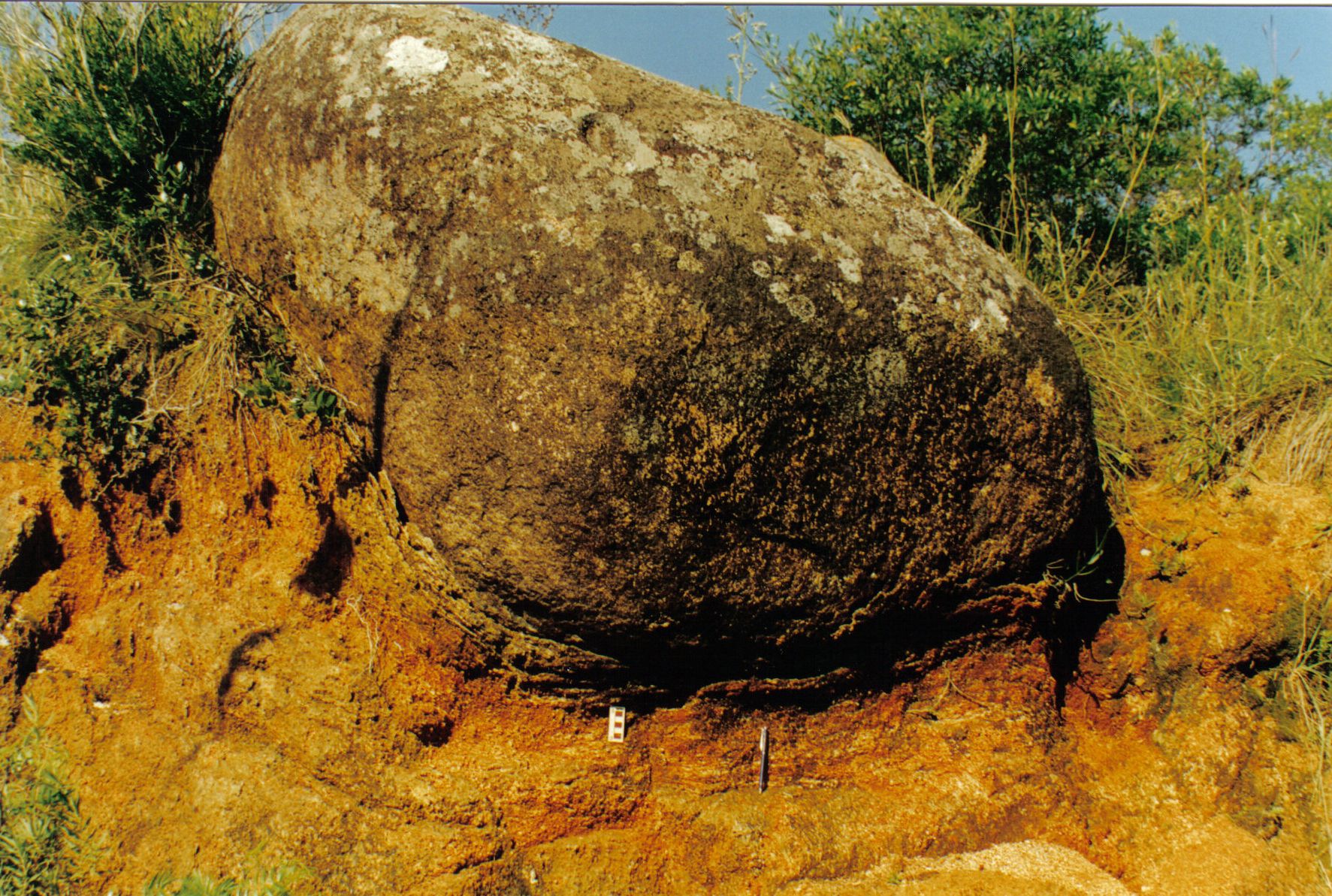 Matacão (boulder) arredondado de granito remanescente ao intemperismo progressivo em forma de "cascas de cebola" (ver estrutura na parte inferior do bloco junto à escala=5cm) com intemperismo maior nos cantos dos blocos fraturados e eliminação de pontas no bloco granítico que tende a ficar com formas arredondadas até esféricas. (Ver foto de conjunto)