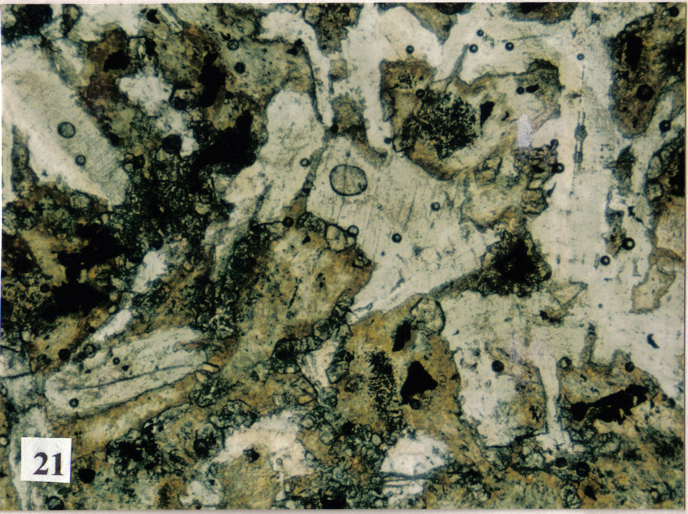 Metadiabásio coronítico da Serra da Figueira no Complexo Barro Alto com textura sub-ofítica preservada. Transformação metamórfica tardia de uralitização (hornblenda verde clara) com exsolução de ilmenita no núcleo do antigo piroxênio com bordas de honblenda de cores mais fortes e coroa de granada reacional. Luz //; lado maior=3,2mm (amostra 2MW593A - fotomicrografia 21 de Winge,M. 1995. Evolução dos terrenos granulíticos da Província Estrutural Tocantins, Brasil Central. Tese doutorado. UnB)
