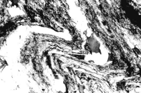Clorita micaxisto microdobrado. Observar quartzo segregado (claro e cinza) em bandas e em charneiras em matriz de muscovita, clorita e biotita sub-paralelas que definem a textura lepidoblástica. Observar que a muscovita apresenta-se dobrada e quebrada na charneira, indicando ser pré tectônica à deformação que produziu as dobras.(Clorita, biotita, muscovita Xisto do Grupo Cachoeirinha, Paraíba, Nicóis +, Lado maior~5mm). (Foto em P/B, M.Winge, 1964)