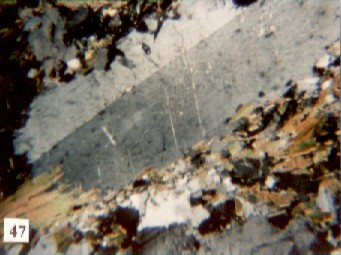 Textura blastoporfirítica com cristal reliquiar de andesina sofrendo quebramentos e recristalizações nas bordas em meta-microdiorito (anfibólio-biotita plagioclásio gnaisse fino), 14 km a oeste de Itauçu, Goiás. Nicóis +; lado maior ~ 3,6mm.
